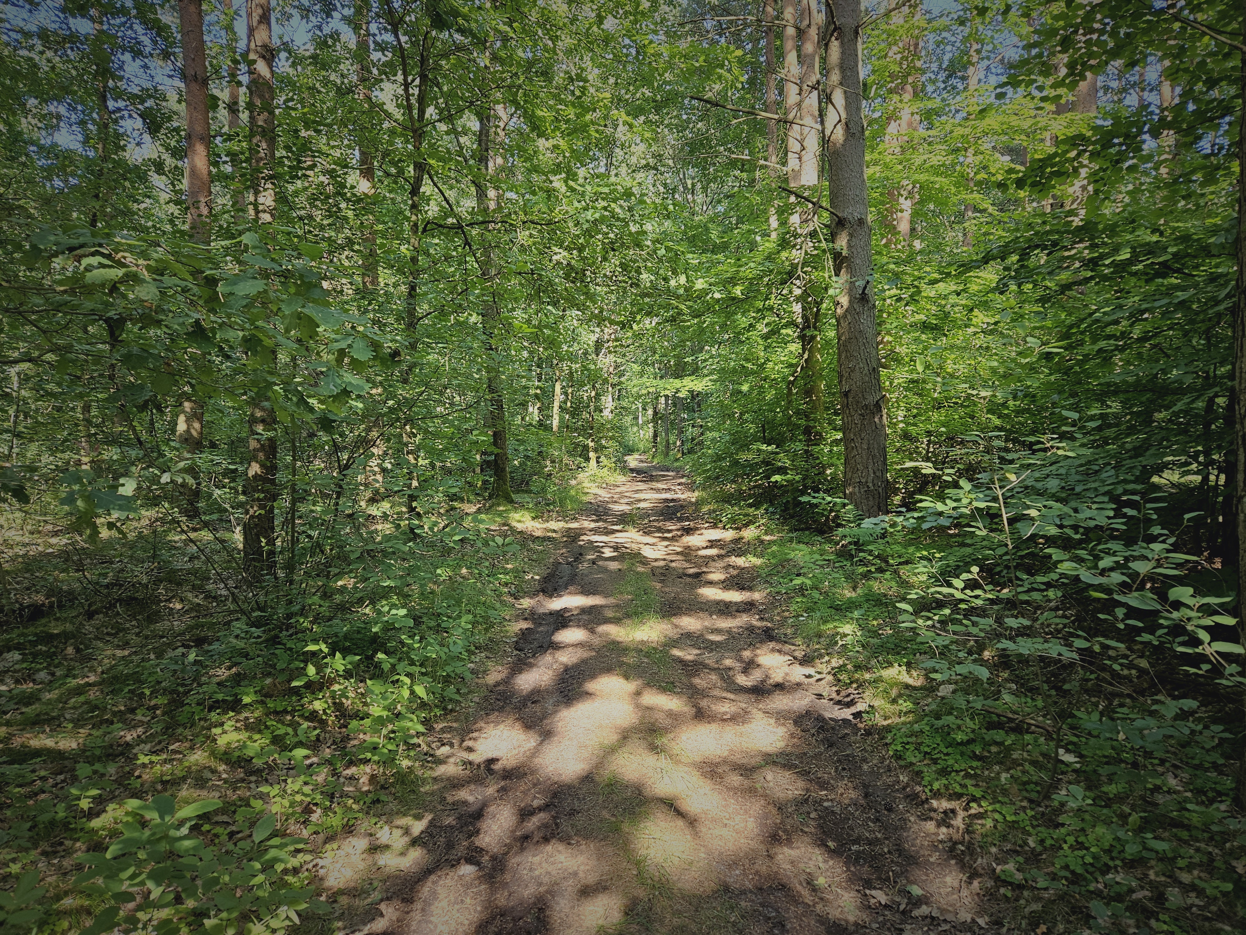 Szlak na którym pracowały maszyny leśne, a wokół niego las - zdjęcie wykonane wczesnym latem, rok po wykonaniu trzebieży.